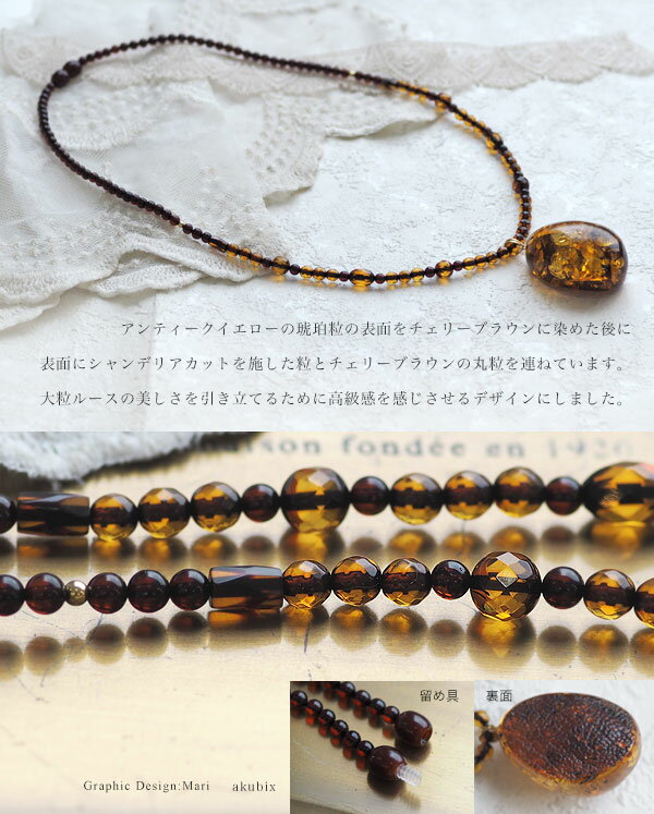 アンティークイエローの琥珀粒の表面をチェリーブラウンに染めた後に ネックレス部分は表面にシャンデリアカットを施した粒とチェリーブラウンの丸粒を連ねています。