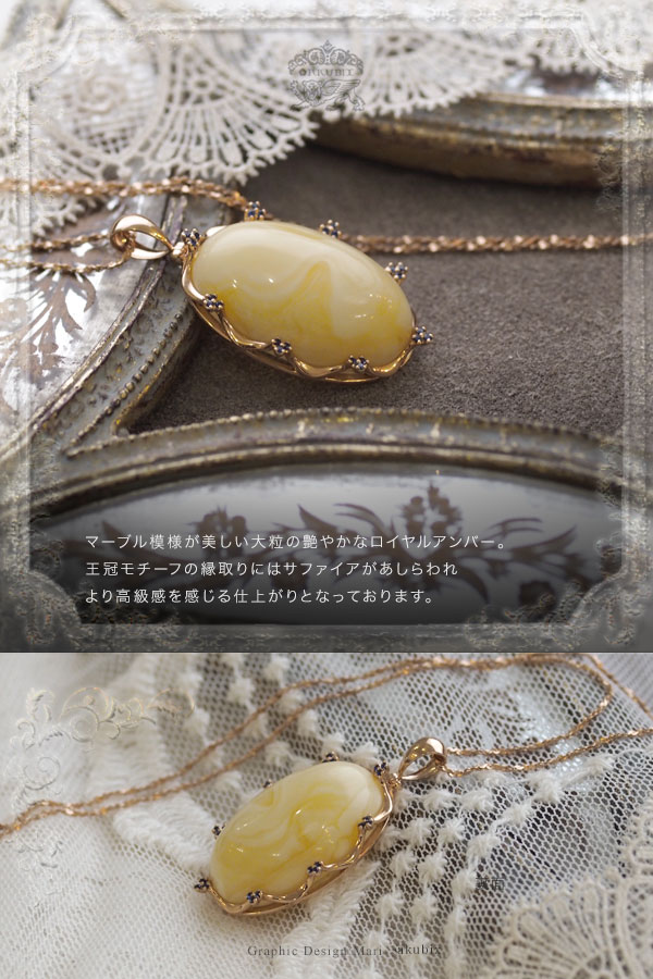/インターナショナルアンバー協会認定正規品 /原産地:ポーランド共和国 /琥珀サイズ:約28×17×h9mm /金属:K18ゴールド /宝石:サファイア24粒 /50cmチェーン付属(K18ピンクゴールドヴェルメイユ・アジャスター45cmー50cmで調節可) /ケース・保証書付 /プレゼントラッピング別途700円【ヴェルメイユ(vermeil)技法】 ヴェルメイユとは純度925または800のシルバーをゴールドの層で覆った貴金属を指します。